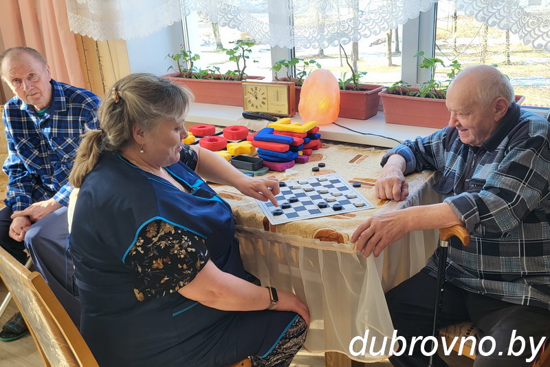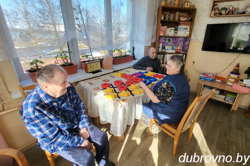 Комфортные комнаты на два-три человека, холл с телевизором, уютная столовая, помещения для занятий физкультурой и творчеством. Везде идеальный порядок и чистота. Но самое главное — домашний уют и человеческое тепло, доброе отношение и забота. Все это — для постояльцев отделения круглосуточного пребывания граждан пожилого возраста и инвалидов Дубровенского ТЦСОН. Под пристальным присмотром работников учреждения, которые к каждому из пожилых людей нашли свой подход, — 26 проживающих.