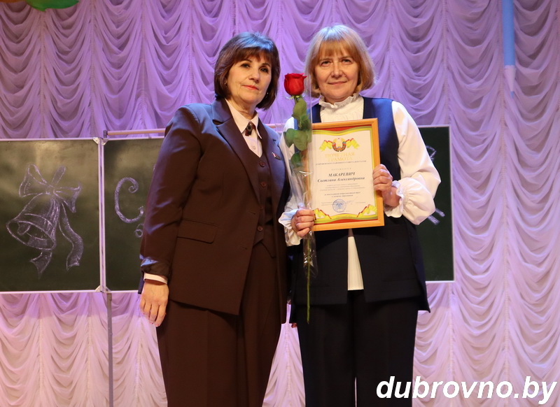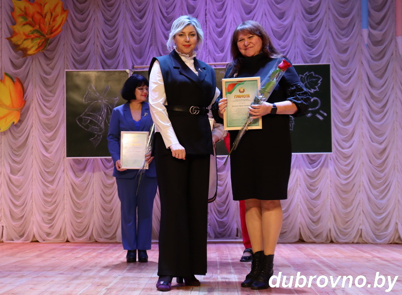 В ходе мероприятия педагогам были вручены Грамоты за добросовестный труд и значительный вклад в обучение и воспитание подрастающего поколения. Так, Почетной грамотой Дубровенского районного совета депутатов награждены Светлана Макаревич, Виктор Трутко из средней школы №1 г.Дубровно им.А.Никандровой и Галина Шинкевич из Осинторфской средней школы. Почетной грамотой райисполкома — Людмила Набздорова и Наталья Аникеева, учителя средних школ №1 и №2 г.Дубровно, Благодарность председателя Дубровенского райисполкома объявлена Марине Сулимовой (детский сад№4 г.Дубровно) и Валерию Гавриленко (средняя школа №2 г.Дубровно им.Ю.Смирнова). Также 14 педагогов были отмечены Грамотами отдела по образованию.