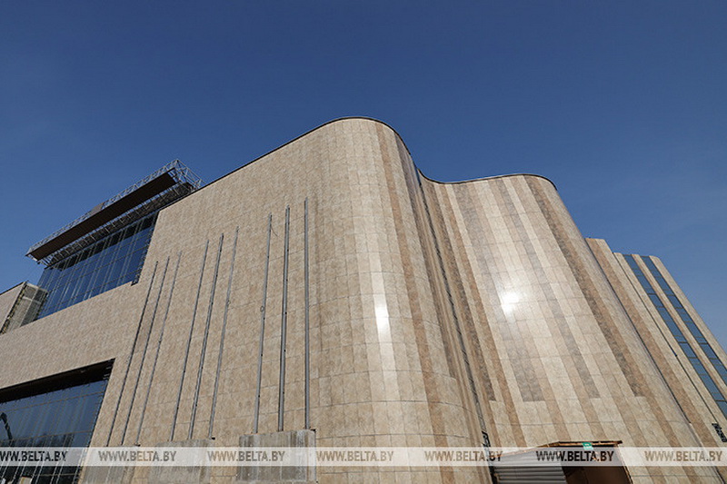 «Мы можем наблюдать сложные отделки потолков. На потолке виден белорусский орнамент, отделка колонн выполняется из гипсовых лепнин. Из гранита выполнена парадная лестница, потом с каждой стороны будет стеклянное ограждение. А так все здание где-то на 75-80% уже готово», — добавил начальник участка СУ-7 стройтреста №4 г.Минска Дмитрий Харитонов.